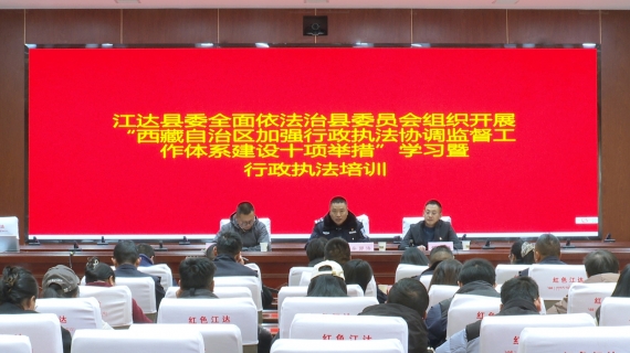 10月28日,江达县委全面依法治县委员会办公室组织全县行政执法部门开展西藏自治区加强行政执法协调监督工作体系建设十项举措学习暨行政执法培训活动,县委常委、政法委书记、公安局党委书记桑郭洛出席并讲话,县司法局负责人主持会议。会议传...