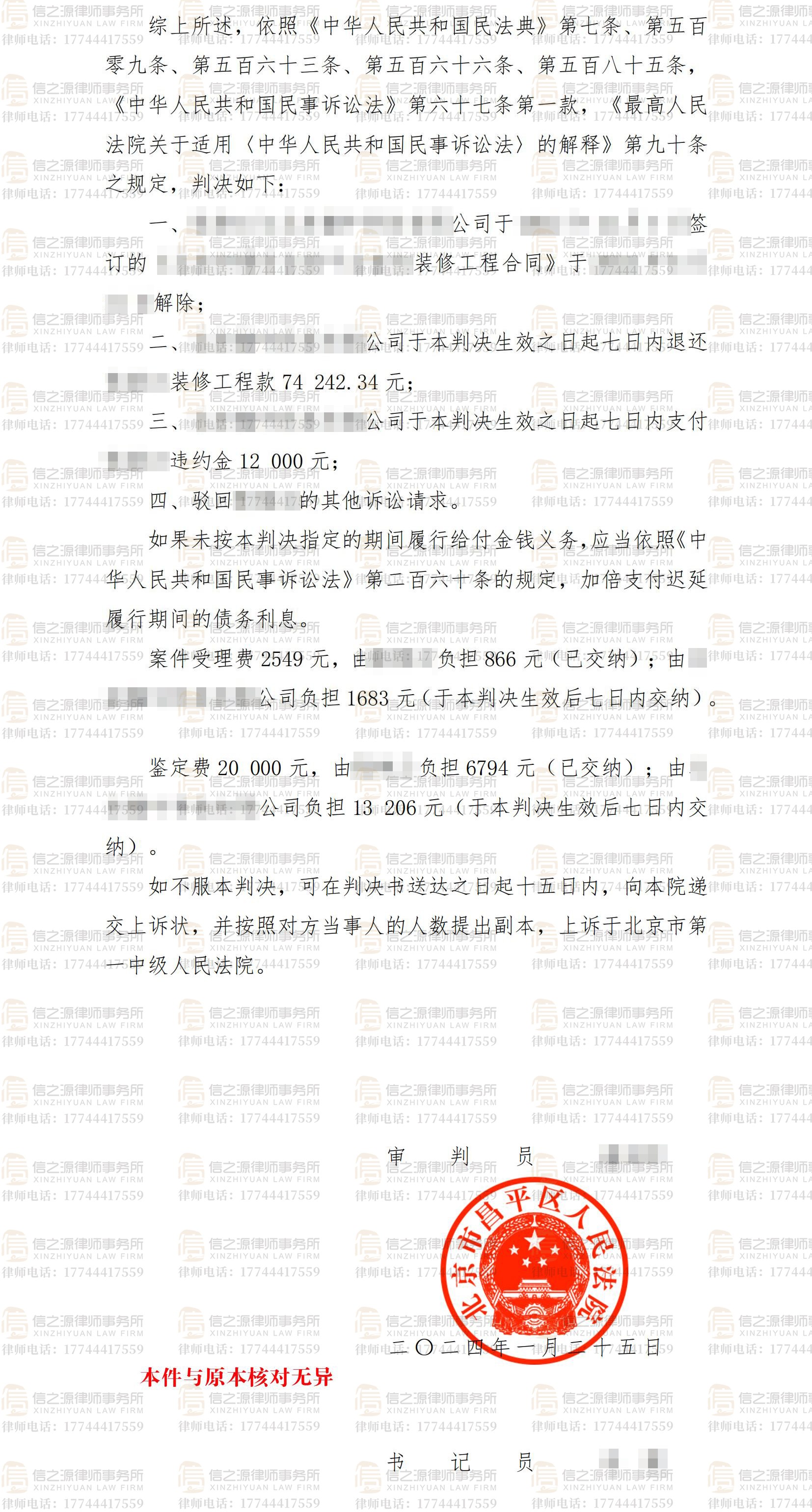 法院最终判决,该装修公司退还王某装修工程款7万4千余元及违约金1万2千余元。